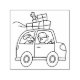 Ein bewegliches Cartoon mit einem großen Notenfahrer in einem Baseballhut, einem Hund im Rücksitz und einem Haufen Kästen und einem Kakteen auf seinem Dach.