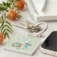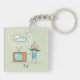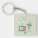 Ein Mann mit einem Schnurrbart, der neben seinem Fernseher stehend ist. Dieses Design wirkt auf diesem Schlüsselanhänger wirklich effektiv