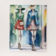 Puzzle. Zwei modisch gekleidete Mannequins mit Hüten und Mini-Röcken laufen selbstbewusst vor einem farbenfrohen Hintergrund.