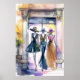 Poster von drei elegant gekleideten weiblichen Figuren, die modische Kleider und breit gebrannte Hüte tragen. Das Ambiente wirkt mit seinen architektonischen Elementen und den sanften, lebhaften Hintergrundfarben sehr elegant.