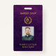 Maßgeschneidertes Friseur-Foto-Mitarbeiter-Abzeichen auf einem eleganten lila Lederhintergrund mit Imitaten Goldschere und Lorbeerkranz-Logo und Typografie-Skript. ++++++++++ Einfach mit Ihrem Firmennamen, Logo, Foto, Namen und Titel und Ihrem Text auf der Rückseite personalisieren. ++++++++++++++ Geeignet für elegante Luxusmännchen, Friseursalon, Herrenhaus oder andere elegante berufliche Exklusivgeschäfte.