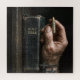 Eine raue Männerhand ruht auf einer abgenutzten Heiligen Bibel und hält eine bronzene Kugel mit der Aufschrift "verteidigen"