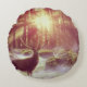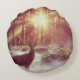 Männliche Hirsche im Misty Woods bei Sonnenaufgang Rundes Kissen