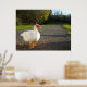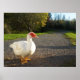 Ein Foto einer männlichen Muskovy-Ente, die auf der Einfahrt mit einem Baum hinter ihm stehend ist.