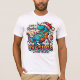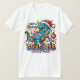 "Feierlicher Dino" mit einem fröhlichen T-Rex in einer Weihnachtsmannmütze, die in leuchtenden Weihnachtsbeleuchtung mit der Beschriftung "Habe ein rauschendes Weihnachtsfest!" verstrickt ist.
