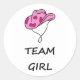 Das wunderschön gestaltete "Team Girl"-Geschlecht enthüllt Party-Aufkleber. Dieser Aufkleber trägt dazu bei, den Ton für eine unvergessliche Genderoffenbarung Set, bei der sich Liebende und Freunde treffen, um die spannende Neuigkeit über das Geschlecht Ihres Babys zu enthüllen. Sie können diesen Aufkleber nach Ihren Wünschen anpassen. Viel Spaß und ein unvergessliches Genie-Fest!