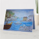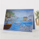 Der Hafen von Quirky mit einem Mann und einem Hund auf einem Boot, eine Möwe und farbenfrohe Gebäude. Hinzufügen von Text zu einem beliebigen Bereich/ einer Kartenseite. Vollständig anpassbar.