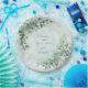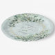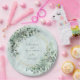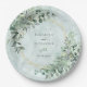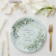 Diese eleganten botanischen Teller aus Aquarellpapier sind perfekt für naturbezogene Hochzeiten geeignet und bestechen durch ihre Bouquets von Eukalyptusgrün, die den geometrischen Rahmen um die Namen der Braut und des Bräutigams und den Hochzeitstag verzieren. Der Hintergrund ist eine elegante Marmorstruktur.