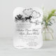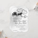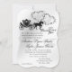 Eine zauberhafte Märchen-Hochzeitseinladung mit einem antiken Pferd gezeichnet Kutsche und Herz mit Monogramm in Silbergrau.