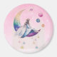 schöne Fee auf einem Halbmond mit hellgalaxischem rosa Hintergrund