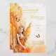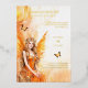 Eine lebendige reale Foliendruck (zwischen Gold, Rose oder Silber) Erholungen vor einem lebendigen, orangen und weißen, rauchgefüllten Hintergrund. Eine exquisite Orangen- und Goldfee mit offenen Flügeln sitzt in der links unteren Ecke und hat zwei kleine goldene Schmetterlinge, die um sie herum flitzen. Sie scheint zu schimmern und zu glänzen und hat lange blonde Haare, die über ihre Schulter kaskadieren. Die Rückseite hat das gleiche Design und eine Single-Vorlage für zusätzliche Formulierungen, falls erforderlich. Wenn nicht, löschen Sie einfach die Vorlage, um die Grafik nur verlassen. Ideal für einen "Fee-Theme" Geburtstag, ein Märchen-Brautparty oder eine verzauberte Geburtstagsfeier für Volksfrauen.
