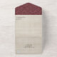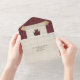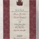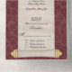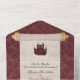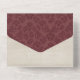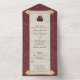 Fantasy Märchen Dreifachfalte alles in einer Hochzeitseinladung in einem burgundischen Damast Hintergrund, mit Grafiken einer Vellumrolle getan. Die Spitze der Schriftrolle ist mit einem burgundischen Schloss geschmückt. Personalisieren Sie alle Textfelder für Ihre Fantasy Hochzeit.