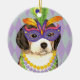 Niedlicher Beagle Welpe, gekleidet in festlicher Federmaske und Perlen, bereit für Spaß auf Mardi Gras oder zu jeder anderen Zeit. Gutes Geschenk für sich und Ihre Beagle liebende Familie und Freunde.