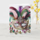 Eine lebendige Maskerade-Maske ist mit farbenfrohen Federn und aufwändigen Juwelen geschmückt und strahlt eine Atmosphäre der Festlichkeit und Eleganz aus. Text kann geändert werden.