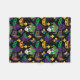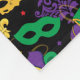 Farbenfrohe Mardi Gras gemusterte Decke mit karnevalsartigen Gesichtsmasken, Fleur de lys Motive und Jestermasken in lila, grün und goldfarben auf schwarz