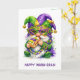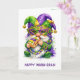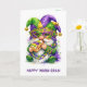 A whimsical gnome, adorned in a vibrant Mardi Gras mask and jester hat, happily enjoys a slice of king cake while sporting colorful beads.