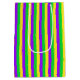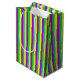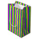 Mittlere Geschenktasche mit einem grünen, gelben und lila gestreiften Muster. Personalisierbar. Ideal für Mardi Gras.