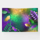 Textural iridescent Mardi gras Hintergrund mit Flecken von lila, gelb und grün, mit flauschigen Federn und glänzenden Perlen dekoriert. Mardi Gras Urlaub.