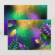 Textural iridescent Mardi gras Hintergrund mit Flecken von lila, gelb und grün, mit flauschigen Federn und glänzenden Perlen dekoriert. Mardi Gras Urlaub.