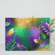 Textural iridescent Mardi gras Hintergrund mit Flecken von lila, gelb und grün, mit flauschigen Federn und glänzenden Perlen dekoriert. Mardi Gras Urlaub.