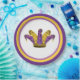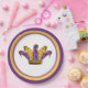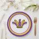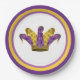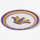 Mardi Gras Jester Hut mit Harlequin-Muster in lila und gold. Die Platte hat auch eine lila und gute Grenze.
