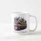 This ceramic coffee mug is shown with Mardi Gras images, Text of "Let the good times roll' is beneath the prints.