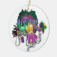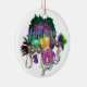 Rundschmuck mit festlichem Bild einer gefiederten Kopfhaut, gefederten Masken, einem genähten Fuchsierhut, Perlen, lila, grünen und goldenen Ballons und zwei lila Amethystherzen auf Weiß. Die Rückseite ist weiß mit optionalem Text. Siehe dazu passende Acrylfotoskulpturenschmuck. Sehen Sie sich die gesamte Mardi Gras Ornament Kollektion in den SPEZIELLEN TOUCHS an | Abschnitt Gastgeschenke.