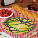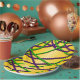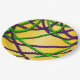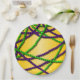 Mardi Gras lila und grüne Perlen auf gelbem Gradientenhintergrund.