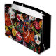 Große, glänzende Geschenktasche mit einem Bild, vorne und hinten, von bunten Mardi Gras Masken mit hellen Federn und Glitzer auf schwarz. Sehen Sie sich die gesamte Mardi Gras Geschenktüte-Sammlung in den SPEZIELLEN TOUCHS an. | Abschnitt Gastgeschenke.