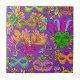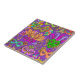 Diese festliche Keramik Kachel ist mit einem Mardi Gras-Design von Masquerade in einer Parade von Farben und Mustern inklusive grün, lila, blau, rosa, orange und gold auf einem lila Hintergrund. Entworfen von weltberühmten Künstler © Tim Coffey.