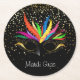 Das Paper Untersetzer Set wird mit einem festlichen Mardi Gras Maskendesign auf schwarzer Hintergrundfarbe mit goldenen Sternen gezeigt. Passen Sie dieses Objekt an und ändern Sie den Stil oder kaufen Sie, wie es ist.