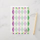 Helle, lila und grüne Diamanten überlagert mit goldfarbenen Diamanten-Konturen und Lilie erinnern an die Enthüllungen und Feiern, die mit einem New Orleans Mardi Gras verbunden sind, während eine cremefarbene Basis diesem Muster eine Touch der Verfeinerung verleiht. Eine gemusterte Lilie sitzt in der unteren Ecke der Schreibwarenhandlung, um eine niedliche Touch zu schaffen.