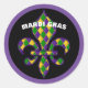 Dieser kleine Rundaufkleber wird in einem festlichen Mardi Gras-Fest Fleur De Li Print Design gezeigt. Passen Sie dieses Objekt an oder kaufen Sie, wie es ist.
