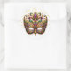 This large size round sticker is shown in a Mardi Gras celebration mask print design.