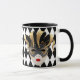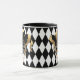 Diese Combo Schwarz-Weiß-Tasse hat ein Bild einer festlichen Mardi Gras-Maske über einem Schwarz-Weiß-Rautenmuster-Druck. Passen Sie dieses Objekt an oder kaufen Sie es wie geplant.