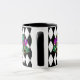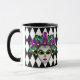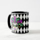 Diese Combo Schwarz-Weiß-Tasse hat ein Bild einer festlichen Mardi Gras-Maske über einem Schwarz-Weiß-Rautenmuster-Druck. Passen Sie dieses Objekt an oder kaufen Sie es wie geplant.