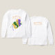 This white long sleeved Tee shirt features a comedy mask, smiling, and a tragedy mask frowning in Mardi Gras colours of gold green and purple, with the caption Mardi Gras February 17th 2026.