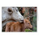 Foto einer Maremmana-Kuh, die im Frühjahrswald stehend das Gehör ihres Kalbes leckt.