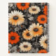 Una textura de tela con margaritas naranjas y tallos plateados sobre fondo negro que combina frescura y misterio.