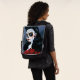 ein Porträt einer Frau, die einen Tag des Zuckerschädels am Totenschmuck trägt, mit rote Rosen in einem blau-grauen Hintergrund