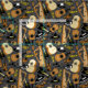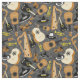 Fun Mariachi Orchester Instrumentenmuster, auf einem weichen grauen Hintergrund. Das Muster zeigt Gitarren, Violinen, Harfen, Trompeten und Sombreros.