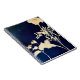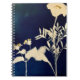 Künstlerisch gefertigte Zyanotypendrucke von goldenen Marigolds auf einem leeren Spiralheft.
