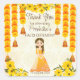 Marigold Garlands niedliche indische Mädchen Haldi personalisierten Namen Brauch Gunst Aufkleber. Gelbe und orangefarbene Geländer mit Glocken, gelber Mandalahintergrund.