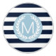 Modernes tiefes Marineblau- und weißesbreites gestreiftes Muster mit kundenspezifischem Lorbeer winden Logomonogramm im hellen Pastellblau, um Ihr eigenes Anfangs-, Namens oder Text zu addieren.