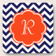 Ein kundengerechter orange Monogramrahmen ist auf einem Hintergrund eines mutigen Marineblau- und weißenZickzack Musters.