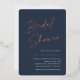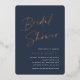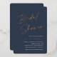 Erleben Sie die Braut mit den modernen und minimalen Brautduscheinladungen mit atemberaubenden Goldfolienakzenten der Rose. Einfaches Design mit "Brautparty" in lässiger, handgeschriebener Schrift. Ihre Veranstaltungsdetails sind rechts in modernen, weißen Schriftzeichen auf dunkelmarineblau-blauem Hintergrund ausgerichtet.