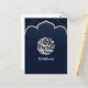 Ein elegantes islamisches Design mit aufwendiger arabischer Kalligrafie, die in einem raffinierten kreisförmigen Emblem auf einem tiefblauen gemusterten Hintergrund platziert ist. Ein eleganter, von einer Moschee inspirierter Bogen und zarte gepunktete Details verleihen einen traditionellen architektonischen Touch, während die saubere "Eid Mubarak"-Typografie die festliche Botschaft vervollständigt. Der Kontrast zwischen reichhaltigem Blau und sanften Beigetönen schafft eine ausgefeilte, zeitlose Ästhetik, die von klassischer islamischer Kunst und festlichen Eid-Traditionen inspiriert ist.
