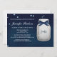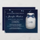 Ein Leuchtkäfer-Maurerglas des herrlichen und eleganten Saphirs der Marine dunkelblauen hued verbindet Polterabendeinladung, die aussehen wie es glüht. Fügen Sie die Initialen und oder Monogramm der Braut und des Bräutigams dem Glas mit einem tiefen blauen und Weiß Druckbandblickentwurf hinzu. Eine subtile Vintage Damastantiken-Spitzegrenze beglückwünscht diesen rustikalen dennoch eleganten Entwurf mit den bezaubernden Leuchtkäfern, die vom Glas inner und äußer sind. Diese lädt sind schön für eine Nachtzeit, einen Barnyard, ein Bauernhaus oder ein Fall-Brautparty-Party des Landes themed ein. Grafik © Chrissy H. Studios, LLC. Alle Rechte vorbehalten.