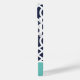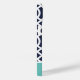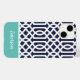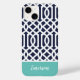 Stilvolle, individuelle Telefonzelle in marineblau, türkis und weiß. Dieses Design zeichnet sich durch ein prächtiges marokkanisches Trellis-Muster aus. Personalisieren Sie es mit Ihrem Namen oder anderen benutzerdefinierten Text in einem modernen Script Monogramm Schriftart. Verwenden Sie die Designtools, um Hintergrundfarben auszuwählen, Schriftart und Farben zu bearbeiten und eigene Fotos hochzuladen, um ein einzigartiges Geräusch zu erstellen!