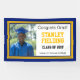 Hang diesen Navy und Gold Grad Foto Banner, um Ihre High School oder Uni Absolvent zu feiern. Personalisieren Sie mit dem Foto Ihres Absolventen, dem vollständigen Namen, dem Unterrichtsjahr und der Schule. Es ist mit einer Gold- und Marinebranche versehen, die das Bild Ihres Absolventen umgibt, deren Name in Marine und "Glückwunsch Grad!", das Klassenzimmer und die Schule in Schwarz.